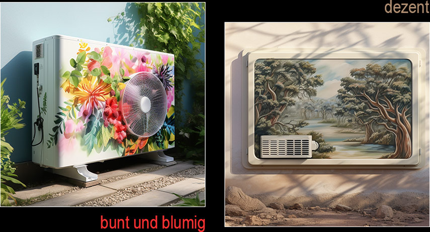 | Die Wärmepumpe als Kunstwerk Verwandeln Sie Ihre einfarbigen Geräte in atemberaubende Kunstwerke. Unser professionelles Team zaubert Blumen- und Landschaftsmotive auf Ihre Geräte. Machen Sie Ihr Zuhause zu einem Meisterwerk der Designerkunst. |