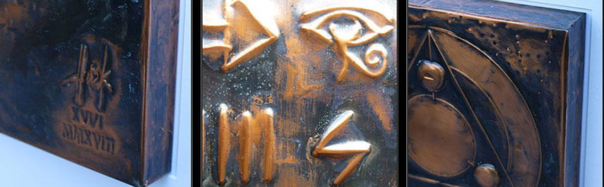 ist ein Kupfer-Relief-Bild. Das Kunstwerk beinhaltet 16 Symbole aus den unterschiedlichsten Kulturkreisen - eine in sich verschlüsselte Botschaft befindet sich links im Bild.
